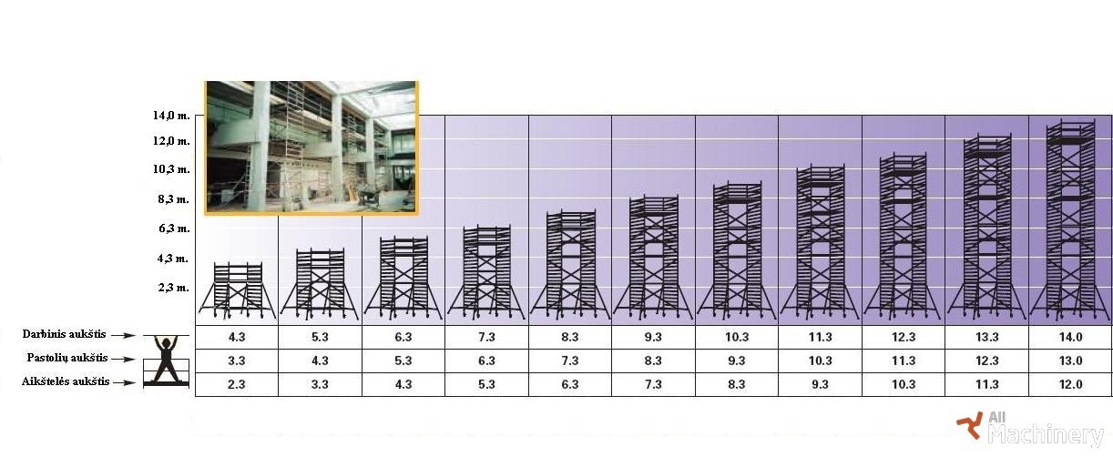 Siūlome patikimų aliuminių bokštelių nuomą darbams aukštyje. Galimas darbinis aukštis nuo 3 iki 14 metrų, todėl bokšteliai tinka tiek vidaus, tiek lauko darbams. Pasirinktinai siūlomas 0,70 m arba 1,30 m plotis, o darbo aikštelės ilgis – 1,8 m arba 2,5 m, užtikrinant patogų ir saugų darbą. Bokšteliai lengvai surenkami, mobilūs ir atitinka saugos reikalavimus.