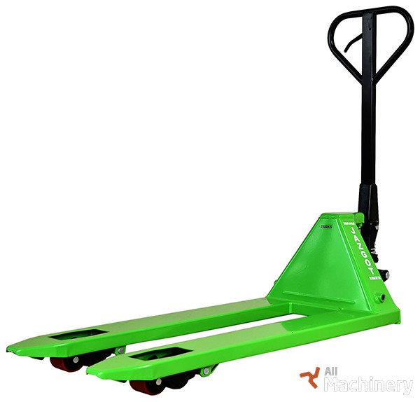 Jazgot 2.5T rankinis palečių vežimėlis Nuosavas svoris: 74 kg Keliamoji galia: 2500 kg Šakės ilgis: 1150 mm Bendras ilgis: 1500 mm